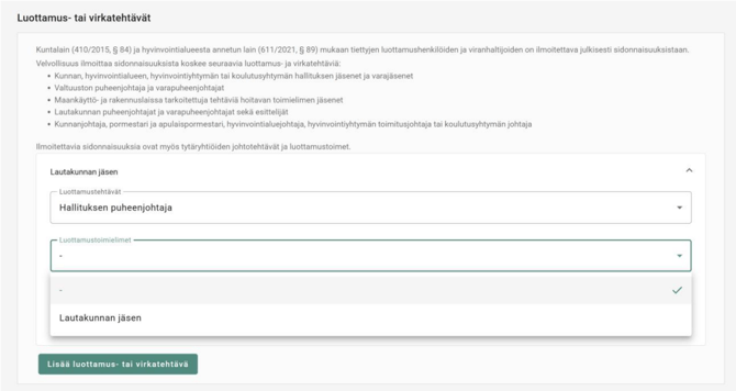 - Kun olet lisännyt luottamus-tai virkatehtävät, siirry lisäämään mahdolliset