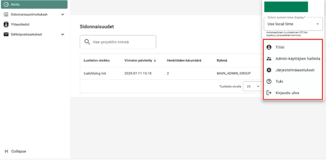 yläkulman valikosta voit hallinnoida omaa tiliäsi sekä lisätä uusia