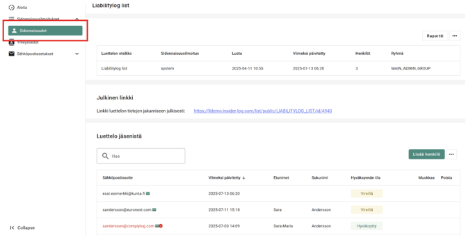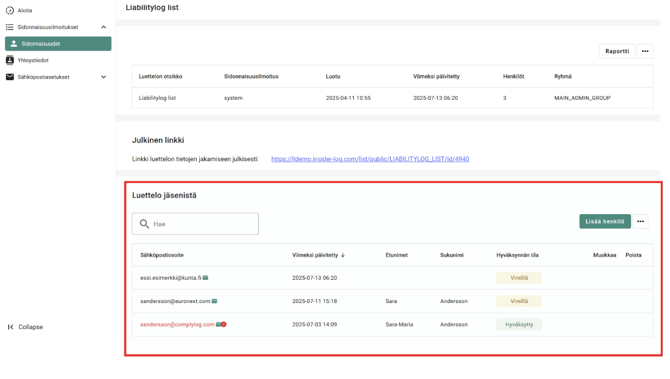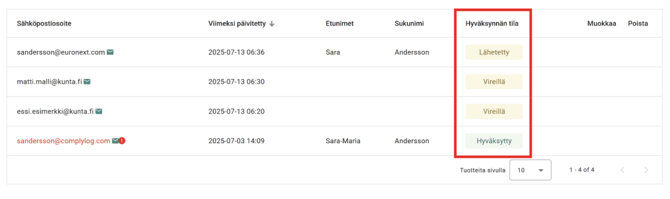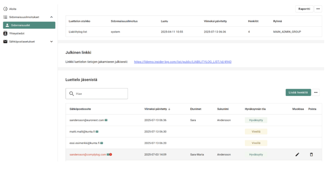 Ilmoituksen status systeemissä päivittyy tilaan ”Lähetetty”. Klikkaa sähköpostin linkkiä tai henkilön sähköpostiosoitetta systeemissä, tarkista