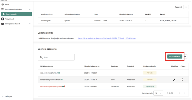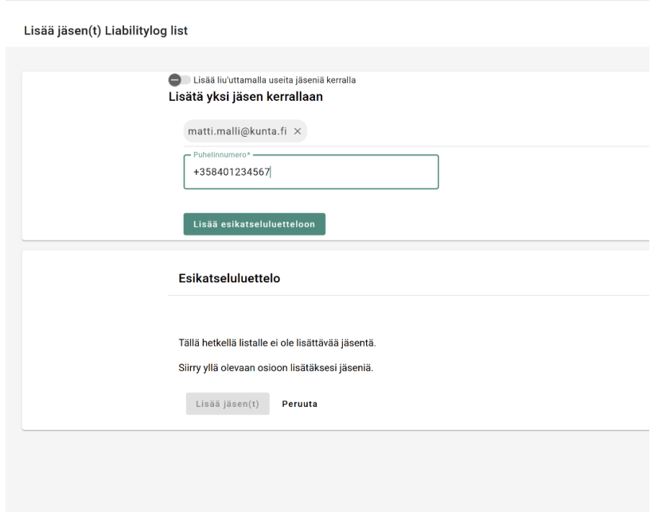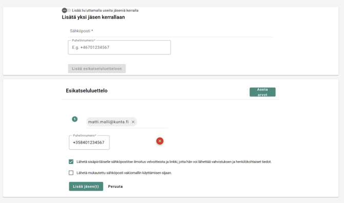 henkilö”. Täytä sähköposti ja puhelinnumero – voit lisätä kerralla enintään 5