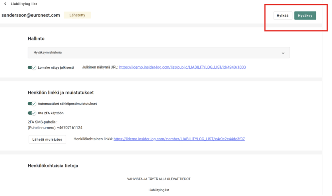 lomake ja tarvittaessa: Täydennä tietoja, Hyväksy tai Hylkää ilmoitus.