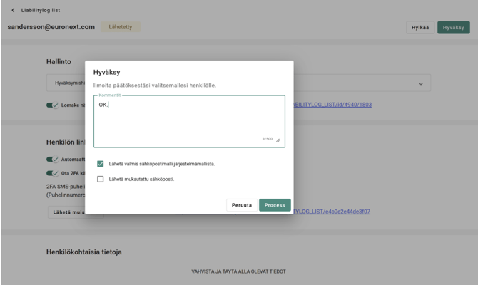 Voit lisätä kommentteja, jotka näkyvät ilmoittajalle kohdassa Päätösmuistiinpanot sähköpostissa.