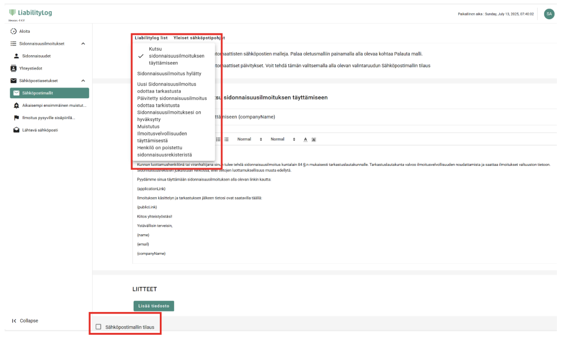 - Jos muokkaat mallia, varmista että "Sähköpostimallien tilaus" - valintaa ei ole aktivoitu – näin emme ylikirjoita muokkaamianne malleja järjestelmäpäivitysten