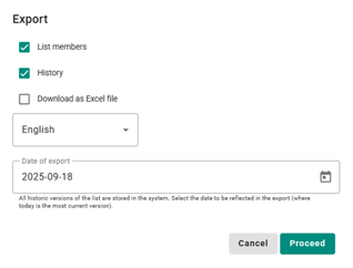 - Using the checkboxes, you can choose the content of your export. You also have the option to download the list as an Excel file. By default, it will be exported in pdf format.