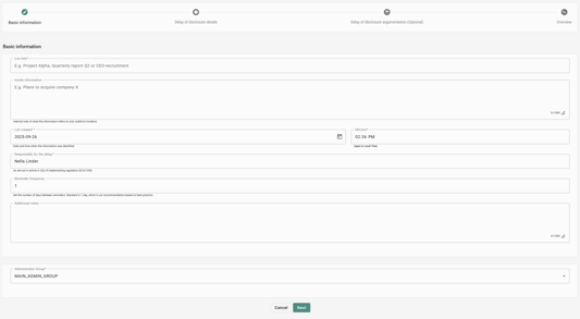This section allows you to input and store your explanation of how the criteria for delaying disclosure, as required by Article 17.4 of MAR, are fulfilled. You may enter this information now or complete it later in the list settings. You may also upload supporting files in the settings page.