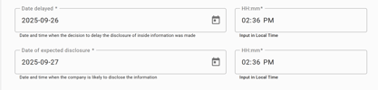 - Fill in the Date delayed field with date and time when the decision to delay the disclosure of inside information was made and the Date of expected disclosure field with date and time when the company is likely to disclose the information