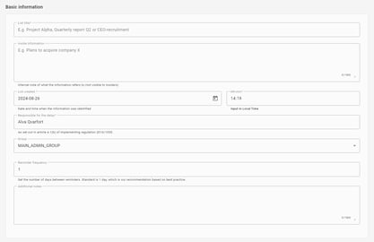 - Under inside information, specify what the information is concerning in further detail. For example, 'Purchase of competitor X'. This will not be visible to the insiders. Only visible to the admin and a part of the documentation of the insider list.